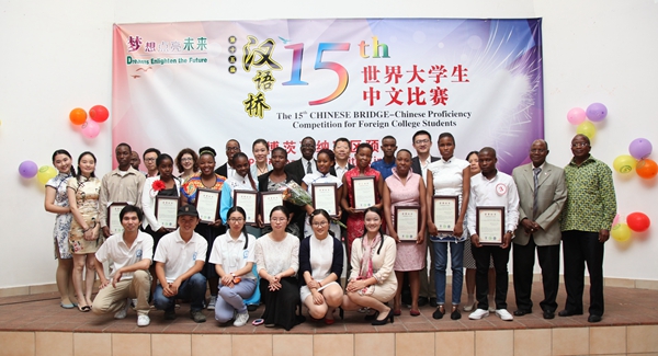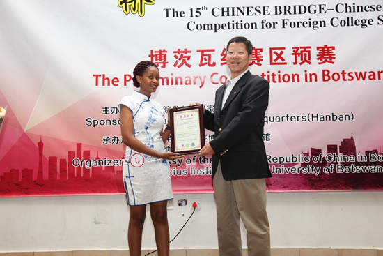 经过当晚两轮的比赛并综合中国语言文化知识笔试成绩,最终王美从12位选手中脱颖而出,获得第十五届“汉语桥”世界大学生中文比赛博茨瓦纳赛区预赛的冠军,她将代表博茨瓦纳赴中国与来自世界各国的大学生一起比拼。