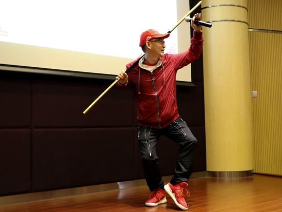“年少贵稳,年老贵忘”,这是六小龄童的师父教导他的八个字,除此之外,他把自己从演艺事业的经历和中国传统文化的角度总结归纳出的一些哲理也一一道来,“一生做好、做精、做成一件事,就非常了不得!”、“西天取经的结果并不重要,过程最重要!”、“前半生表演猴戏,后半生传播中华传统文化”,用“团结精神、理想信念、拼搏进取、乐观向上”十六字勉励师生。六小龄童充满感染力的语言和丰富的表情动作让在座师生听得如痴如醉,掌声不断。最后,六小龄童还即兴耍起了“美猴王”的金箍棒,引得在座师生连声喝彩。