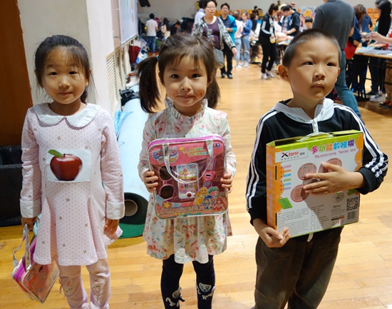 今年的六一活动现场由爱心义卖场、亲子游戏场和欢乐爬爬场三部分组成。爱心义卖场延续了去年六一活动的创意,在义卖展位前,小朋友们在家长的帮助下售卖自己的私人物品,奉献爱心,最终500多元的义卖所得全部捐赠给了上海师范大学教育发展基金会。亲子游戏场设置了多项不同种类的亲子游乐活动,包括亲子背背乐、爱的抱抱、叠纸站立、亲子传物、乒乓接力、速记π、萝卜蹲等,每个项目都需要家长和小朋友一起配合完成,完成项目后集章兑换奖品。活动激发了小朋友们极大的参与热情,和家长们一起欢乐地做游戏,兴奋地数着自己的奖章数量,换取自己喜欢的节日礼物,活动现场处处洋溢着孩子们的欢声笑语。在欢乐爬爬场,主办方搭起了一个猴子蹦蹦床,让年龄小的孩子也有机会感受节日的欢乐氛围。