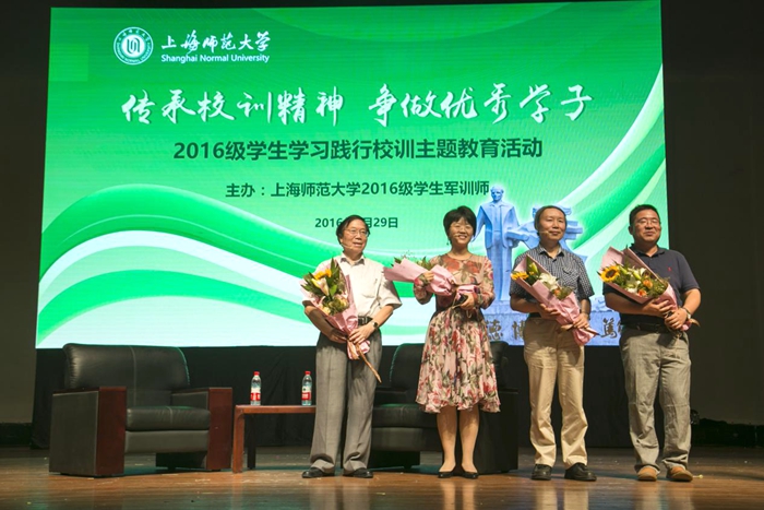 8月29日上午,2016级学生学习践行校训主题教育在奉贤校区上师大剧院举行。上海警备区海防二旅副旅长、上海师范大学军训师师长彭瑞林,校党委副书记、副校长、军训师政委葛卫华出席活动。谢晋影视学院姜杉老师应邀主持,2016级全体新生和指导员在现场和转播教室参加此次活动。