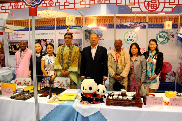 2014年,在孔子学院成立十周年之际,孔子学院总部决定将每年9月份的最后一个星期六,定为全球“孔子学院日”。9月24日,是第三个全球“孔子学院日”。我校与博茨瓦纳大学合办的博茨瓦纳大学孔子学院开展了“中国电影文化节”和“中国文化周”等活动,隆重庆祝“孔院日”。中国驻博茨瓦纳大使郑竹强(下图右四)、孔子学院外方院长Part Mgadla教授以及中方院长董建萍等出席庆祝活动。