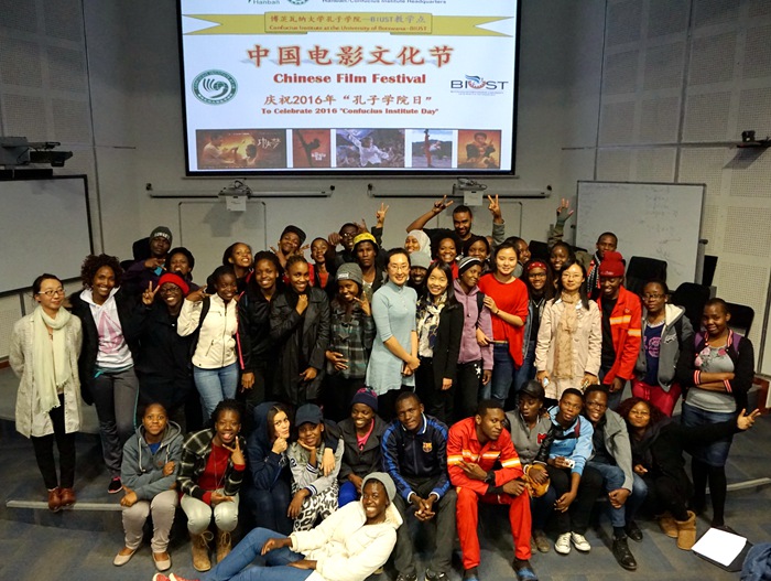 博茨瓦纳大学孔子学院在本部以及在博茨瓦纳国际科技大学汉语教学点,同时开展“中国电影文化节”系列活动,放映了《海洋天堂》、《西游记之大圣归来》、《太极》和《杜拉拉追婚记》等六部影片,展示中华文化艺术的魅力以及当代中国的精神风貌和老百姓的生活,同时还介绍了中国电影发展史、著名导演、知名演员等相关知识,引起了观众极大的兴趣。