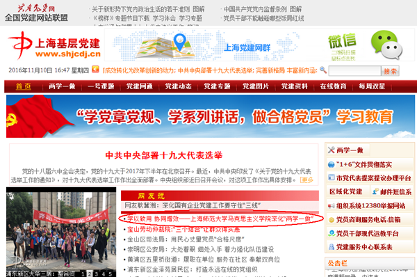 11月10日,上海基层党建网以“学以致用 协同增效——上海师范大学马克思主义学院深化´两学一做´”为题,报道了我校马克思主义学院深化“两学一做”学习教育活动的举措。全文如下: