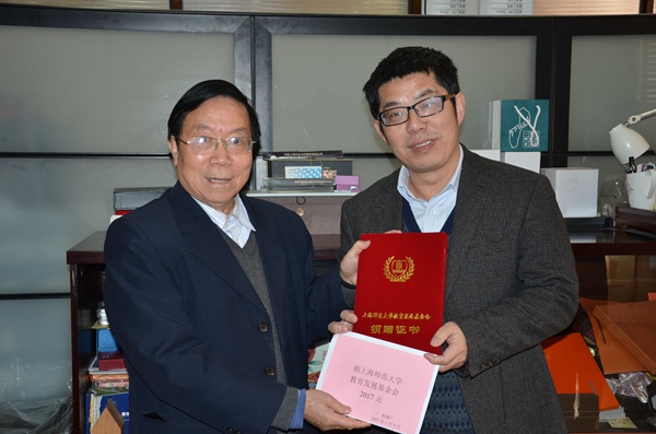 1月3日,新年上班第一天,杨德广教授来到校教育发展基金会,向基金会捐赠2017元,同时带来了翁敏华教授的善款2017元,共同祝愿学校2017年取得更大的发展。这已是杨德广教授连续第十四年在新年工作首日向学校捐款。校教育发展基金会理事、副校长刘晓敏代表基金会接受了捐赠并颁发了捐赠证书,感谢他在新年之初向基金会慷慨捐赠,并送上新年祝福。