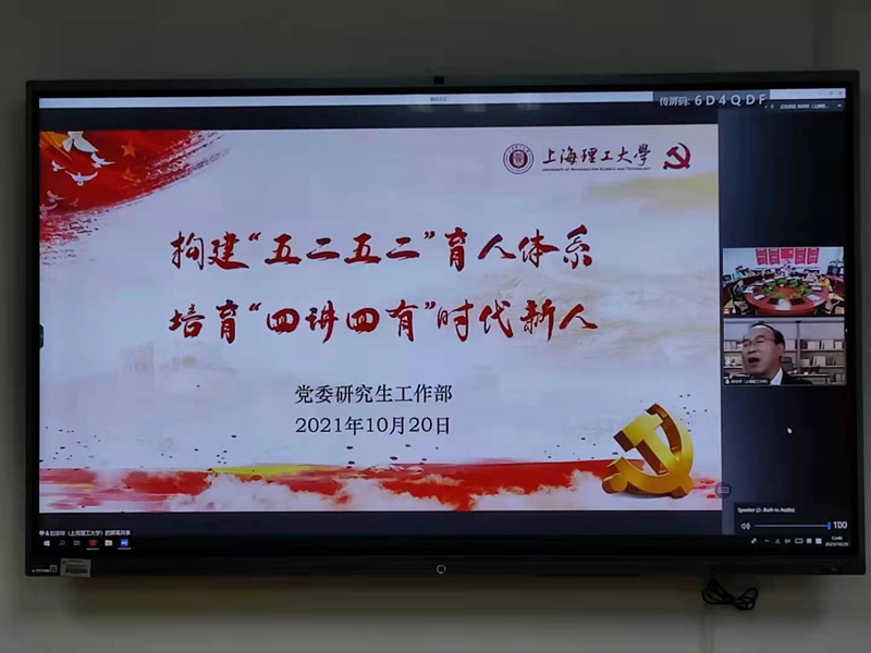 10月20日下午,上海理工大学研究生工作部部长、研究生院副院长彭忠祥开展了“构建‘5252’育人体系,培育‘四讲四有’时代新人”专题讲座。他首先向学生党支部书记介绍了上海理工大学研究生党支部建设的现实缘起,其次他深入解读了“构建‘5252’研究生党建育人体系”这一创新举措。“5252”中各个数字分别代表“5个实”、“2个深入”、“5个强”、“2个长效”的党建工作方向。其中从“队伍建设”、“学习成效”、“创树品牌”、“组织培训”、“实践服务”五个方位增强“实”,提升党建育人成色。从“深入社会基层”“深入实践一线”二个方面做到“深入”,扎牢党建育人根脉。从“头雁作用”“示范作用”“党建阵地”“意识话语”“特色凸显”五个方向展现“强”,完成党建育人定位。从“建立主题教育”“建立人才引领”两个维度达到“长效”,夯实党建育人。这一创新举措为我院学生党建工作的具体展开带来许多启发。