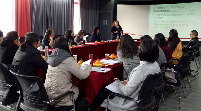 玛丽•休斯博士现任波士顿大学教育学院语言教育讲师,英语教学网上课程(TESOL Online Program)主任,研究专长为母语习得及第二语言习得、语言教育、语言学等。休斯博士此次于我院举办的专题研讨会名称为“真实学术文本之复杂语法教学”(Instructing Complex Syntax in Authentic Academic Texts),针对英语学习者(ELL)在阅读学术文本时遇到的复杂语法现象,及相应教学方法展开了讨论。对英语学习者而言,掌握学术语言对其学习及职业生涯的成功,都是至关重要的。语言教师需识别学术文本中的词汇、语法和篇章特点,并针对这些独特的特点采取相应的教学策略。此次研讨会通过互动的方式,使参会者阅读不同体裁的学术文本,思考不同文本的独特语法手段,并探讨相应的教学方法。