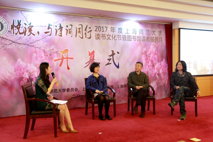 揭幕仪式后,举办了“悦读,与诗词同行――学者访谈”。活动邀请我校副教授刘青海,华东师范大学出版社六点分社文学编辑古冈,诗人、旅行作家、导演、艺术家、媒体工作者韩博,三位分别从事古代诗词研究的学者和现代诗歌创作的诗人坐客访谈节目,就古代诗词、现代诗歌的学习和创作,对人们思想和言行的影响和意义及其相互关联进行了访谈。上海师范大学读书协会及徐汇分会分别策划组织了开场节目“汉服表演”和串场节目“相声表演――我为诗词狂”,为开幕仪式预热助兴。