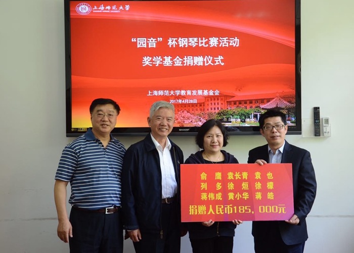 俞鹰夫妇代表捐赠方每年向上海师范大学教育发展基金会捐赠约3万元人民币,共计6年,捐赠金额总计185,000元,成立“园音”杯钢琴比赛活动奖学基金。作为2017年我校第一笔以家庭为单位组团且有明确项目的捐赠 ,“园音”杯钢琴比赛活动奖学基金致力于鼓励和培养学生更好地提升艺术水平和专业素养。这笔奖学基金饱含着三个教师家庭的高尚师德品质和奉献精神,以及对学校、学院发展和学生成才成长的殷切希望。