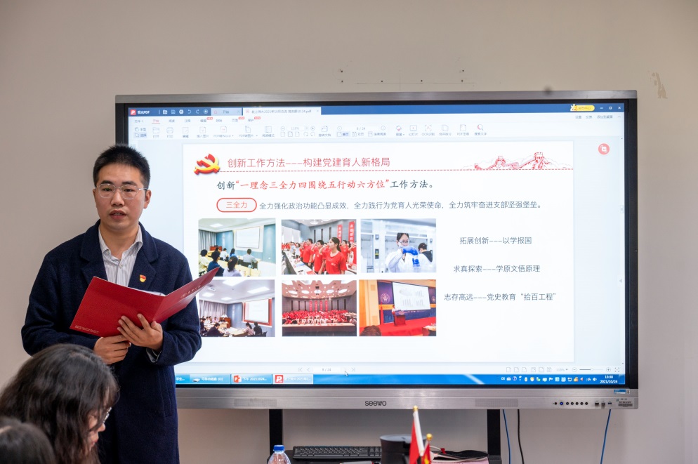在学生党支部建设工作交流环节,上海师范大学学生样板党支部培育支部——化材学院奉贤本科第一党支部书记张旖旎老师首先分享了支部工作经验和感悟。张旖旎老师从三全育人的视角谈了对大学生党员发展工作的认识,指出要以“全员育人”为保障,严把学生党员发展关;以“全方位育人”为目标,设计学生党员培养方法;以“全过程育人”为抓手,完善党员发展工作体系。
