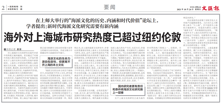 日前,在上海师范大学举行的“海派文化的历史、内涵和时代价值”高端论坛上,海内外专家给出了建议:海派文化的生命力本就源自海纳百川,城市是文化发展与精神文明的集聚地,梳理城市文化的发展历史,为新时代海派文化研究纳入新的内涵,才有助于把弘扬城市精神和海派文化贯穿到核心价值、城市治理、文化建设、科技创新、人居环境、城市品牌等各个领域,使上海这个超大城市真正成为软硬实力结合的有强大竞争力的城市生命有机体,并成为展示中国建设伟大成就的对外窗口。