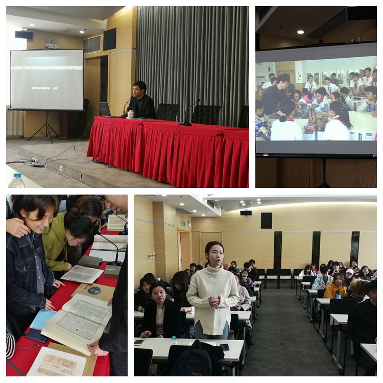 徐军老师作为全国美术教育领域里研究传统文化美术课程的知名专家,在讲座中为师范生展示丰富多彩的书籍、雕版等文物道具,并结合自己的成长经历,勉励师范生在教学中通过收集各种素材、阅读大量书籍、根据兴趣进行学科探索、旅游中收获美术感悟等方面提升自己的美术知识与教学经验,在抗压与承受负重感中不但完善与磨砺自己,在教学科研的坚持中树立成为优秀美术教师的信念,并为此目标而不断践行努力。