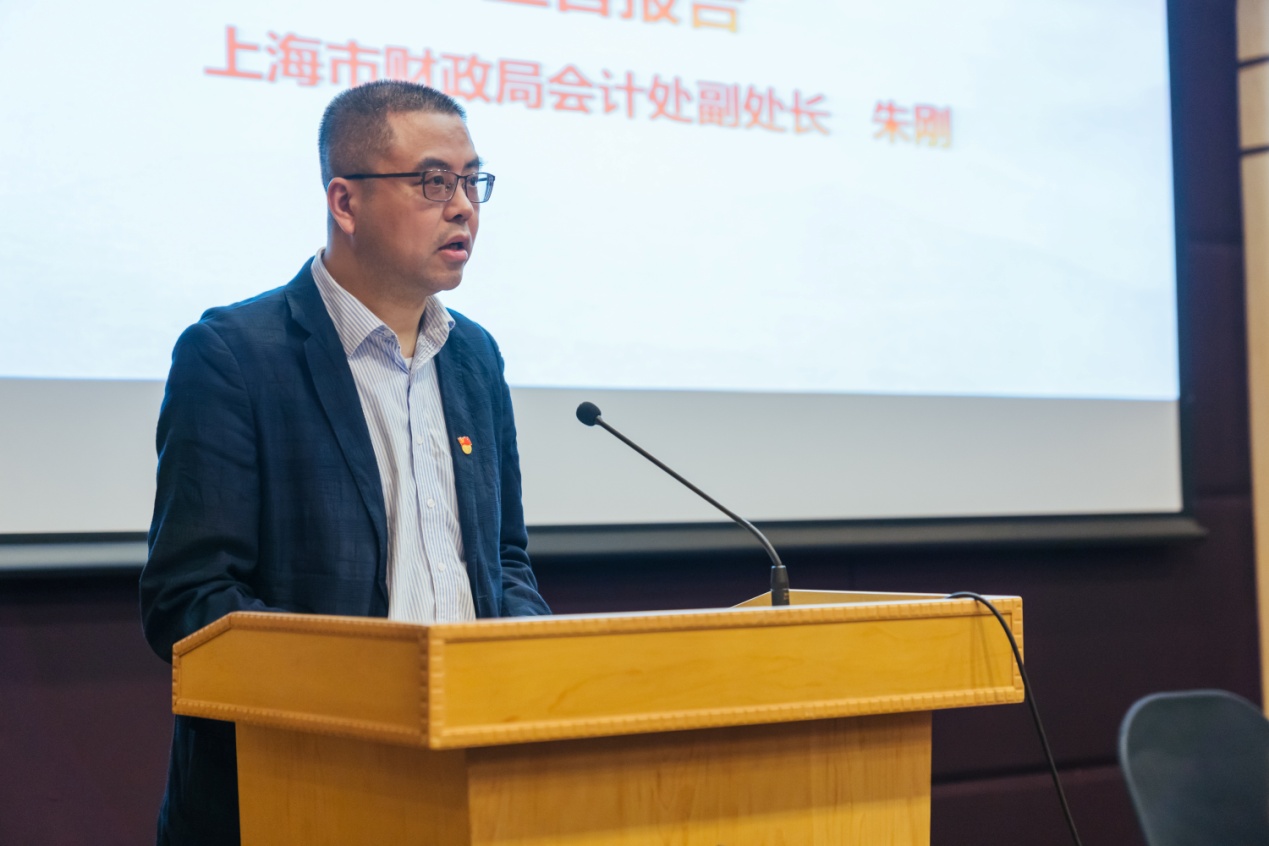 接着,上海市财政局会计处副处长朱刚为本次活动带来主旨报告。朱处长不仅分享了他对未来会计人才发展趋势的深刻见解,还为学院财务管理人才的培养提出了很多有建设性的建议。此外,朱处长还对在场的大学生提出几点希望:一是先有作为,再有地位;二是证书是门槛,而能力则是关键;三是要有“先一步”的主动思考能力;四是积极培养立体思维,注重持续学习、沟通、团队、写作等能力的塑造;五是坚守诚信的品格,拥有健康的体魄和敢于担当和抗压的能力。这些简短而精辟的金句让在场的师生受益匪浅。