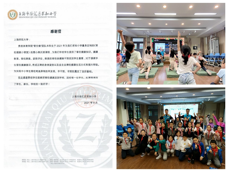 体育学院党委发挥“体医融合”的特色,体育教育为健康服务的理念,为中小学生量身定制《脊柱健康小课堂》,在上海市徐汇区求知小学开设脊柱健康课程。通过脊柱健康知识、脊柱健康教育、姿势评估和筛查、运动预防、营养干预等版块,采用健康教育和运动手段进行干预,开班前和阶段性结束后测评,全程跟踪效果的形式,提升学生脊柱机能,引导学生健康生活,形成良好的锻炼习惯,实现早发现、早干预、早预防,为健康中国、健康校园助力。