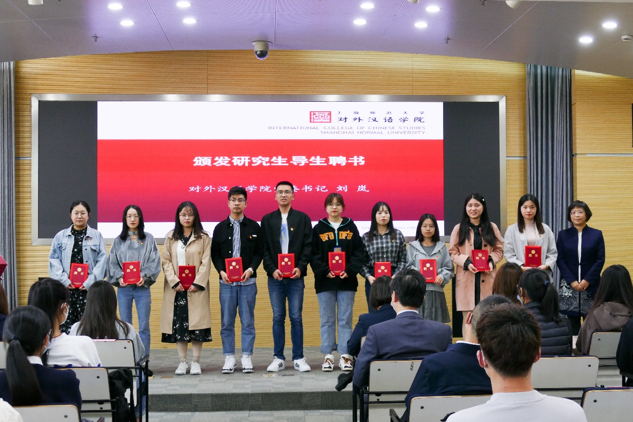 随后,对外汉语学院党委书记刘岚为学院2021年聘请的10位研究生导生颁发导生聘书。