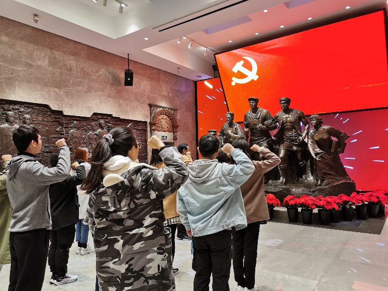 纪念馆中近千张照片再现了五卅运动前夕中国共产主义革命运动的奋斗历程,党员同志们在讲解员的带领下重温了历史。中国共产党第四次全国代表大会于1925年1月在上海举行,是大革命前夕召开的一次重要会议,为大革命高潮的到来,作了政治上、思想上和组织上的准备。在参观过程中,刘岚书记勉励年轻党员们:“中国革命的历史就是最好的教科书,回顾历史才能更好的走向未来。”同志们纷纷表示:“在中共四大纪念馆的生动课堂中,我们学习党史,感悟使命,激发了浓浓爱国主义之情,想以满腔热血投身于祖国建设中去。” 参观完毕后,在“工农联盟”主题雕塑前,黄刚老师带领全体支部党员重温入党誓词,回顾初心使命。