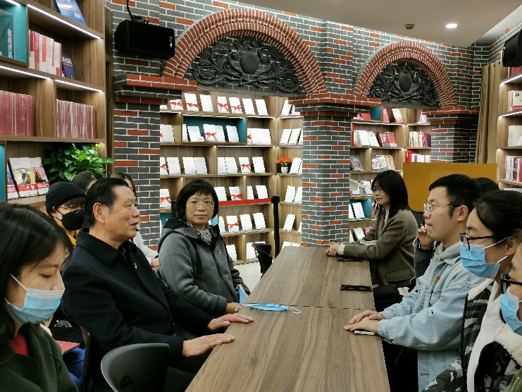 随后,同志们一同前往1925书局进行座谈交流。黄刚老师告诉学生党员们,这里曾是革命先辈陈云宣誓入党的地方,并强调:“青年党员应看清历史发展潮流,在享受当今时代的繁茂时,更应该经受磨练。”在谈到青年党员的使命担当时,黄老师更进一步劝诫同学们:“大家只有抓住今天和明天,才能有后天。”听了黄老师的讲话,同志们感触颇深,本硕党支部曾婧婧同志结合我国疫情防控的显著成绩谈道:“正因为有中国共产党这个坚强的领导核心,我们在面对突如其来的疫情时才能做到号令四面、组织八方。正因为中国人民深深爱着中国,我们在面对突如其来的疫情时才能做到一方有难,八方支援。” 陆熠同学表示:“爱国主义不是虚无缥缈的说辞,如何做新时代学生楷模,首先要把爱国情怀深深植根于内心,对国家、对人民、对脚下的土地抱一份浓浓的爱。”