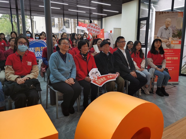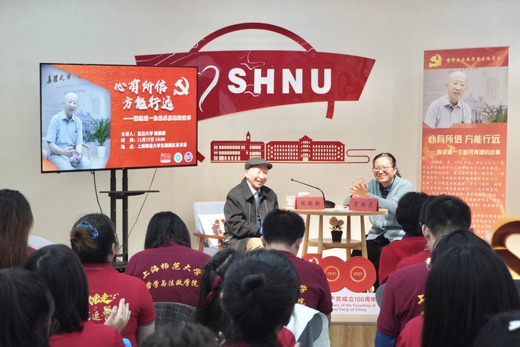 有意思的是,今夏刚刚入党的陈望道之子、83岁老教授陈振新,当天下午也在上海师大东部园区。与邹市明分享的“拳拳爱国情”主题相近,他也与师生们忆起父亲作为复旦大学系主任时,如何多次保护进步学生的真实事例。