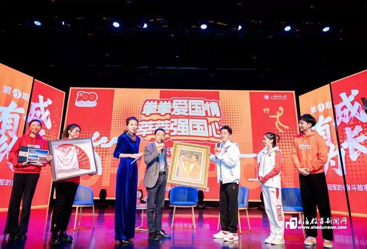 上海师范大学党委副书记、副校长葛卫华代表学校向三位嘉宾分别赠送了油画专业学生创作的“夺冠时刻”油画、校功夫扇团队的签名队服以及上海师大特色文创,为冠军们送上师大的专属祝福。