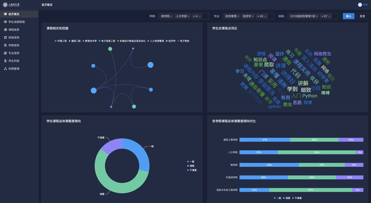 上海师大在线教育的数字化管理界面涵盖在线课程相关性挖掘、学生观点反馈、课程满意度评价、学院课程状态评价