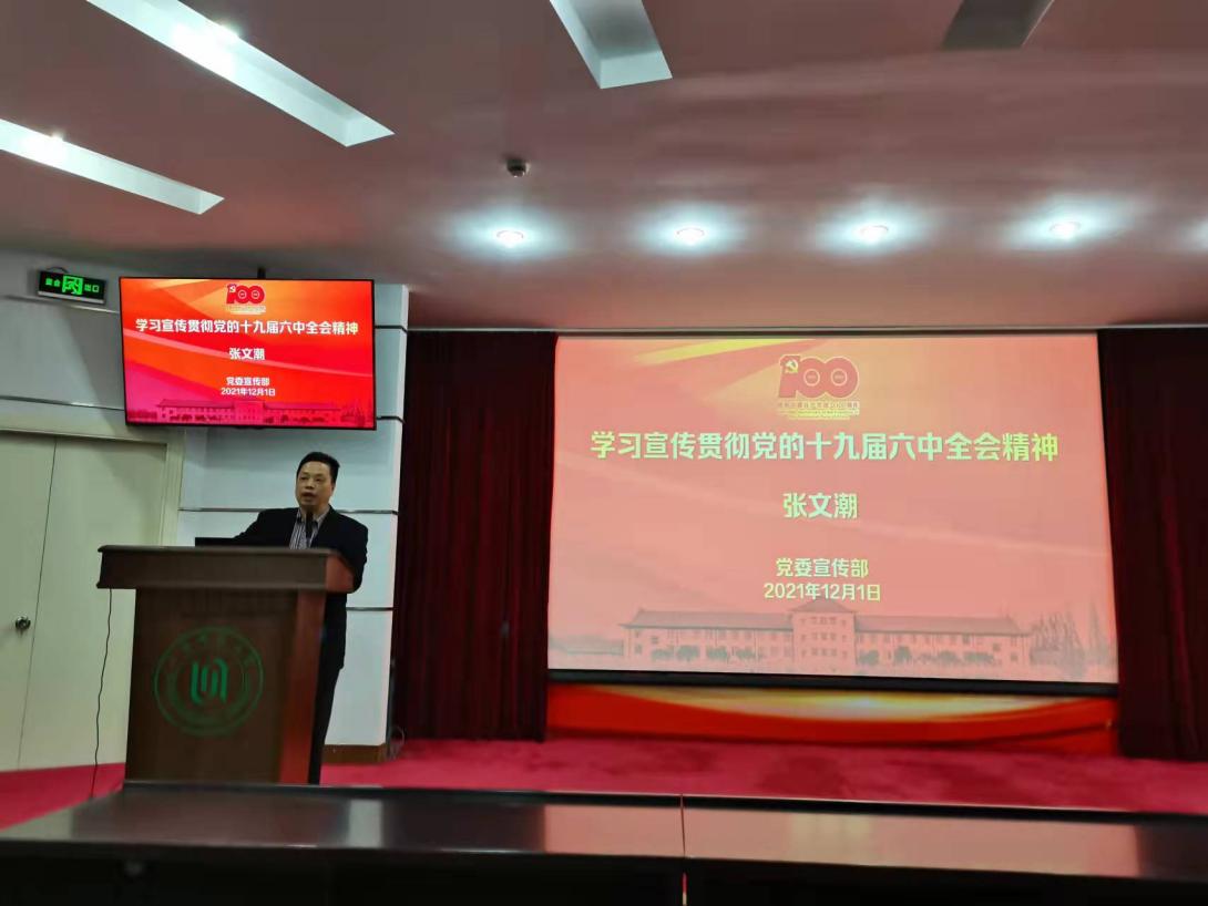 12月1日下午,数理学院党委举行全院青年教师学习十九届六中全会精神报告会。校党委常委、宣传部部长张文潮受邀作题为《学习宣传贯彻党的十九届六中全会精神》的报告,会议由学院党委书记樊连生主持。