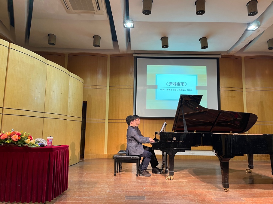 第三组演奏的曲目是由朱璟廷和黎家豪同学一起演奏的四手联弹作品《潇湘夜雨》。这首作品由朱璟廷同学作曲,乐曲充分表现了潇湘雨夜的朦胧意境,朱璟廷同学自幼对创作很感兴趣,他自述在创作这首乐曲时是根据原有的文学作品,融合了潇湘的民族风格,写意更多,作品中有部分音型是对“雨滴”的描绘,尝试用音乐来诠释文学作品中的意境。