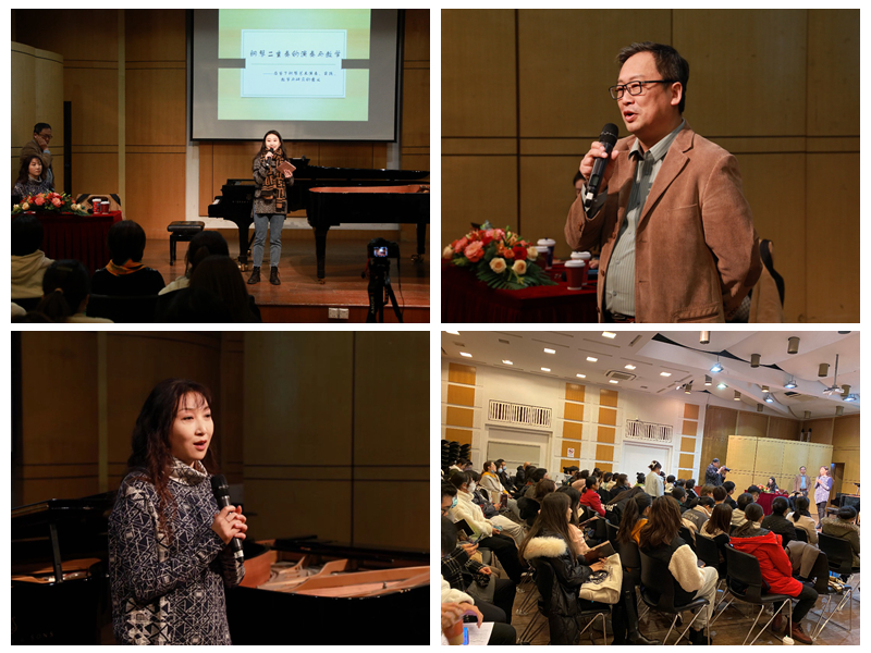 钢琴系主任俞鹰副教授致欢迎词。俞老师向在座师生介绍了“叠艺”组合的渊源。“叠艺”二重奏是由来自上海音乐学院钢琴系的李世卫、董海珠老师组成的钢琴二重奏演奏组合。两位老师历经了十多年的艺术合作生涯,利用繁忙的教学工作之余,在国内多地举办四手联弹、双钢琴音乐会及讲座。除了保留与发扬这一传统演奏形式外,他们更为这一艺术形式注入了新的活力与新的元素。从古典音乐到当代流行、跨界音乐的新风尚,“叠艺”二重奏组合凭借着他们对艺术热爱与探索的精神,为广大爱乐者呈现了一部又一部精彩的钢琴重奏作品。同时,他们也积极与其他领域的音乐家们合作,推出形式新颖的音乐表演,时不时为大家带来惊喜。