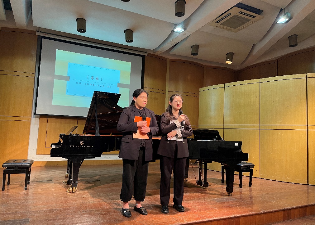 第一组演奏的曲目是由徐云啸老师改编的《浏阳河》,这是一首双钢琴作品,演奏者是徐云啸老师本人和沙漠同学。两位的演奏如高山流水般清新、流动,徐云啸老师在演奏后向大家介绍了在创作与练习该曲时的一些心路历程,徐老师提到他在改编时较为困难的是作为一个演奏者如何能做到在尊重原作曲家创作意图的基础上再做创新,于是在《浏阳河》的基础上加入了一条大河的旋律,并利用钢琴来模仿弹拨乐的音效,进一步复刻出水流的声音,这样改编后的作品听起来更加优美动听。