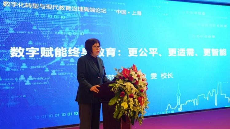 上海师范大学校长袁雯教授代表主办方致欢迎辞,并作了题为“数字赋能终身教育:更公平、更适需、更智能”的主旨演讲。