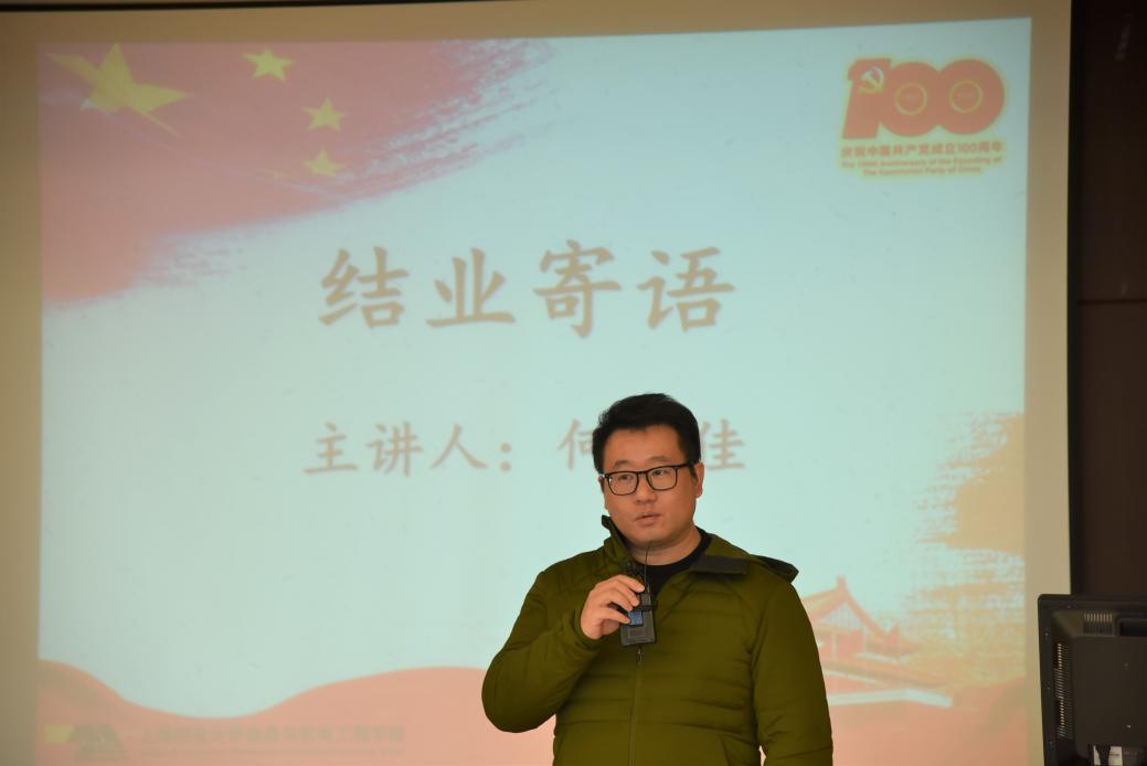 大会伊始,何佳致结业寄语,他对本次入党积极分子培训班给予了充分肯定,并对同学们提出了一些新的要求:第一,明确入党动机,学史增信。他强调,同学们入党首先要知道成为共产党员不仅是一种身份,更是肩上的一个责任,要从党的辉煌历史中接过为人民服务的接力棒,走好新时代的长征路,我们任重而道远;第二,持续深化理论,学史明理。目前大家已经是积极分子了,未来可能成为发展对象、党员,但我们不应执着于大学期间是否入党这件事,入党其实贯穿我们一生,我们应当把学习当成一种“习惯”,持续学习,常学常新,让入党成为不断地“自我革新”,总结反思,温故知新,只有这样才能让自己的思想之树,理想之花茁壮成长;第三,坚守入党初心,学史力行。同学们以后无论是工作或者深造,都将成为国家建设不可缺少的一员,要从百年党史中的宝贵智慧和优秀党员身上的经验财富中汲取不断奋进的前进力量,争取为自己的入党历程、人生旅程和党的前程都写下光辉的一笔。