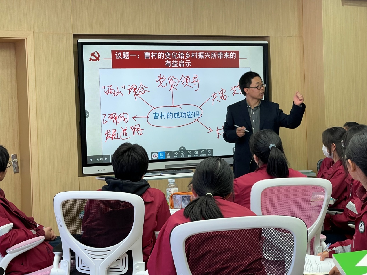 课堂上,赵梓涛老师以“习近平谈生态文明建设”的视频作为导入,以议题式教学,结合学生“研学之路”的情景剧,探究曹村发展成功转型的密码,在探究中培养学生分析问题的能力;通过“绿水青山”变成“金山银山”的具体推导过程,使学生深刻理解“绿水青山就是金山银山”的发展理念,进而理解人与自然和谐共生的深层次内涵;通过苏州河的变迁,使学生体会上海践行“绿水青山就是金山银山”的重大抉择;结合美丽校园建设,使学生关注身边事,注重可持续发展观念和绿色生活方式的形成。