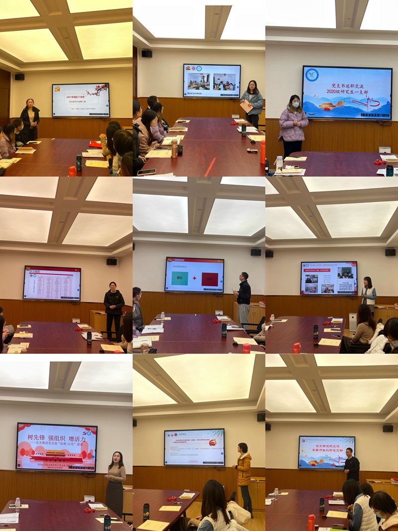 12位本研学生支部书记围绕学生党员常态化教育、设岗定责活动落实情况、党员作用发挥等方面进行了汇报。世承党支部书记郝思嘉展示了支部成员在党史学习、服务群众中发挥的作用,特别是对贵州福泉二中线上班级教学,全年累计授课30余次,授课时长约50小时。华英师生创新党支部与区域共建,为康健街道送去英语儿歌课程,支部服务达到30人次。