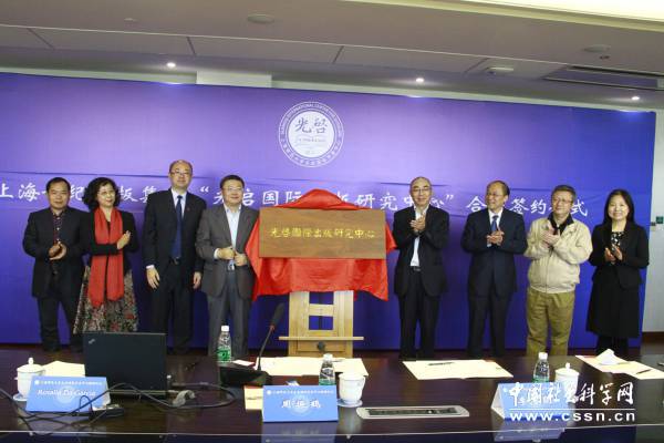 为推进高端学术出版研究,增加知识界、学术界、出版界真正优秀的产品在社会中的能见度,光启国际学者中心与上海世纪出版集团正式签约,创建“光启国际出版研究中心”,彭卫国、阚宁辉、王为松、张峥嵘、康年、陈昌来、马英娟、陈丽菲揭牌,王为松与康年签署合作备忘录。