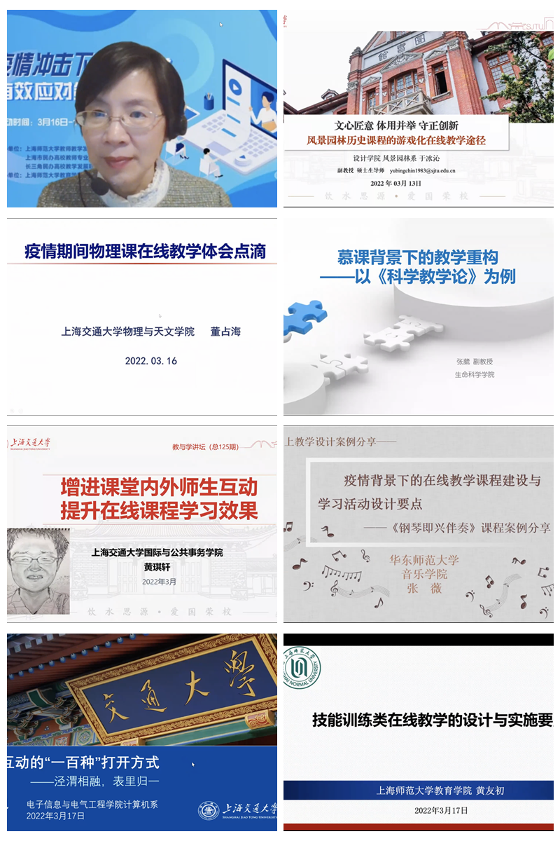 在疫情防控常态化背景下,线上教学已经成为高校教学的常态,如何保障线上教学质量正在成为推动高校教学改革与人才培养质量提升的重要议题。为进一步提升高校在线教学质量,优化线上教学各环节设计与实施细节,我校教育学院、教师教学发展中心于3月16日和3月17日在线上组织开展了两场“疫情冲击下在线教学有效应对策略分享会”,邀请上海交通大学、华东师范大学及本校专家教授,围绕“如何设计在线教学课程”“如何激发学生在线学习主动性”“如何运用在线教学工具”“如何评估在线教学效果”等重点、难点问题开展线上分享交流。来自上海师范大学、上海市民办高校、长三角民办高校教学发展联盟理事单位的教师踊跃参会,两个晚上有1745人次的教师们相聚云课堂,共同探究提升在线教学质量的有效途径和方法。会议由上海师范大学教育学院教师发展中心常务副主任、长三角民办高校教学发展联盟秘书长徐雄伟教授主持。
