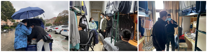 随着学校进入准封闭状态,秉着原则与温度并行的精神,学校开通了上海有住所学生回家的通道。2019级机械设计制造及其自动化1班的学生王子睿便在开放出校权限的第一天申请回家,但风雨交加的天气下,学生拿着大包小包的行李寸步难行,辅导员林峰提前想到了这种情况,主动提出开车送学生至校门口,让学生感受到了学校的温度。