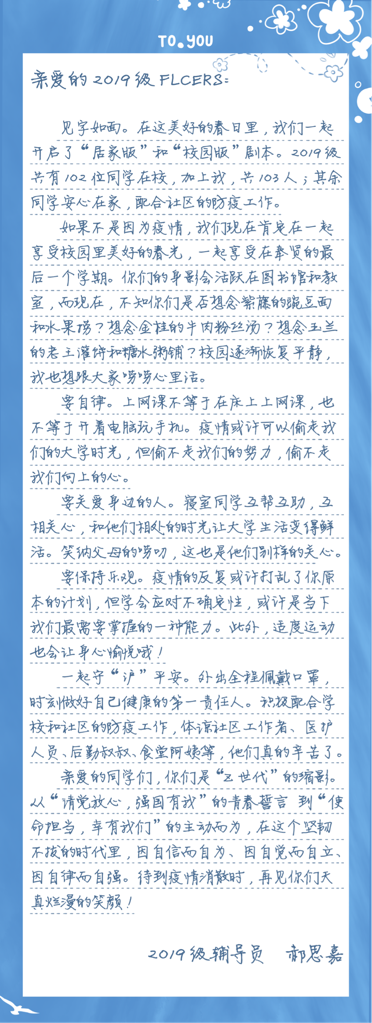 学院辅导员郝思嘉时刻关注学生动态,认真排摸学生情况,用一则则温馨的线上通知和一声声温柔的线下叮嘱守护学生安全,将各项防控措施落到实处。距离无法阻隔她对学生的惦念,她将关心和爱护写进了信里,鼓励19级学生自为、自立、自强。
