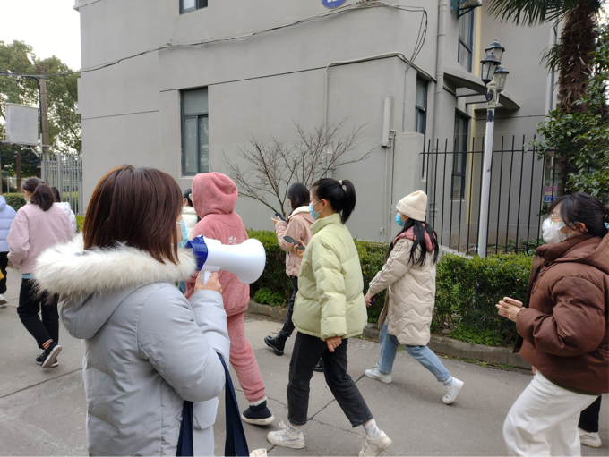 辅导员郭浩澜组织学生间隔一米,有序前往核酸检测点,手持喇叭不断重复着“听指挥、留距离、戴口罩”的提醒,为同学们健康安全提供保障。