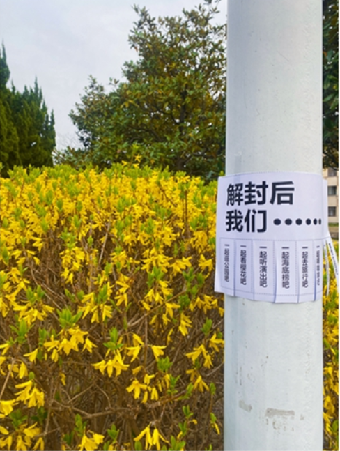 解封之后,我们一起……旅游学院的学生自发在校园里面贴了一些小纸条,希望这些小纸条可以带给封闭在校的同学们带来好运和开心。待到解封之后,让我们一起去干所有喜欢的事情!这些暖心的小纸条,还被很多同学拍照发在了校园墙上,并表示自己从中感受到了温暖和浪漫。