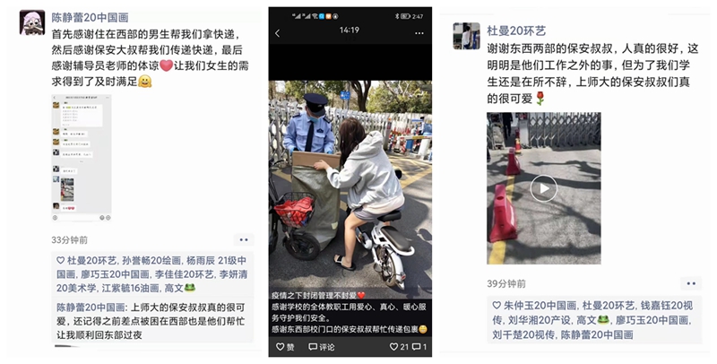 此外,美院学生在搬运画架时得到了保安大叔的热心帮助,在朋友圈表达感谢,传递这份暖暖的温情。封校不封爱,责任始在肩。上海的春天终将绽放,期待最美师大解封那一天到来!
