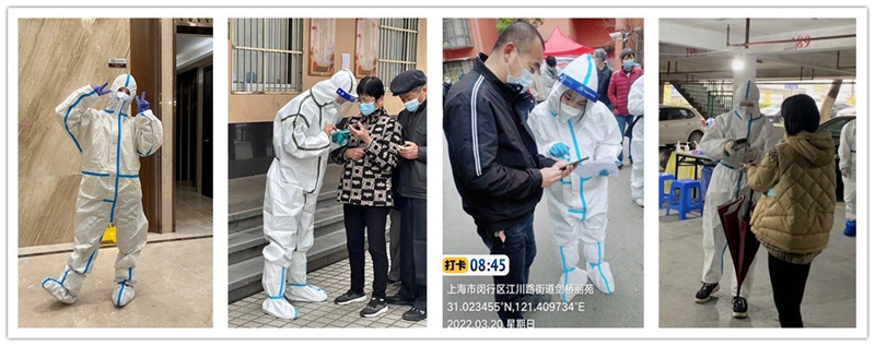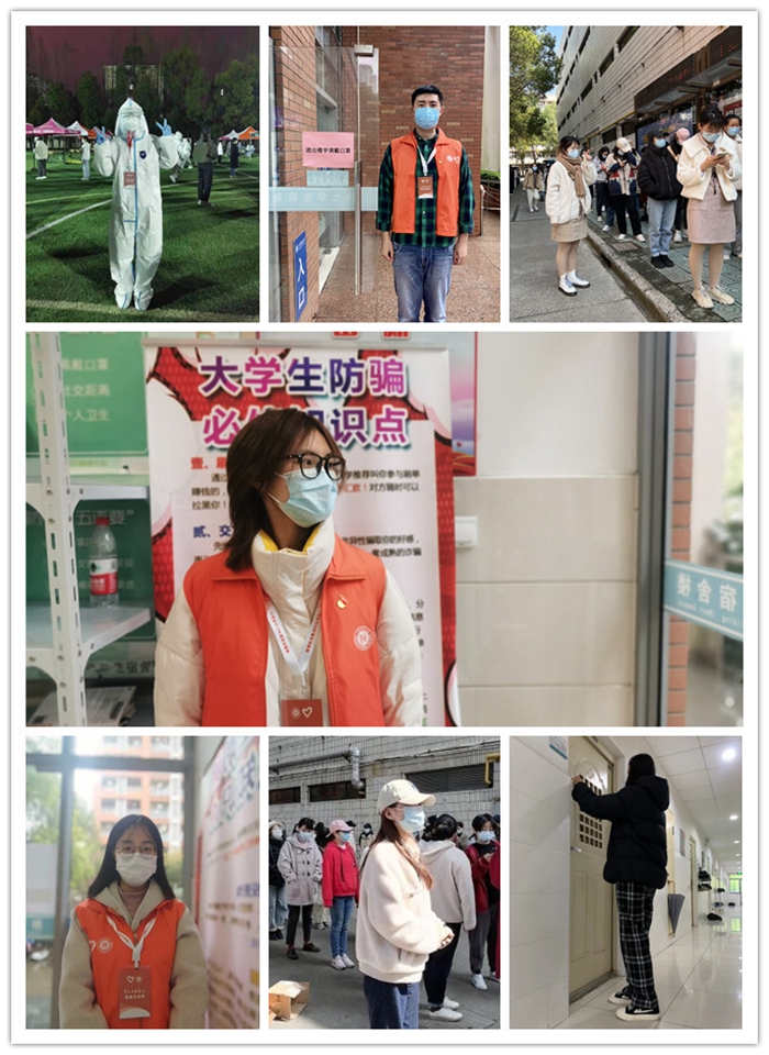 徐汇园区44支部的王莹莹、李俊麒在接到东部核酸检测志愿者临时招募通知后第一时间报名参加,穿上“大白”服装,说的最多的一句话便是“大家请往里走,请保持一米间距”;园区17支部的程一民服务于西七男生宿舍,负责宿舍楼门口值班工作;2020级研一支部耿冰珂、孙心怡、龚昕,2020级研三支部居嘉婧、谯娜服务于西九女生宿舍楼,她们组织楼内同学有序核酸、统计信息、早晚查寝、站岗服务,奉献青春力量。