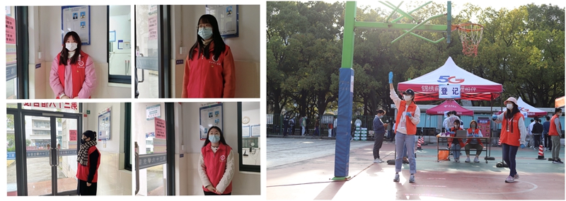 校园外,外国语学院世承党支部沈天晔在所在社区加入了新冠抗原自测志愿者行列,分发和回收检测试剂;2020级研二支部的施俐娜响应社区号召,成为了一名社区核酸检测志愿者,指导居民使用健康云、登记二维码等;园区16支部的经丽丽和谢欣怡同样是一名社区疫情防控志愿者,她们协助医务人员和社区工作者做好检测、扫码录入工作。