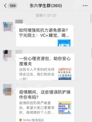 东六宿舍楼里开展起了心理防疫小组沟通会,提供心理支持与安慰;楼内骨干定时定点发送“安心抗疫”心理资源包,探讨防疫小妙招,推送健康“小贴士”……