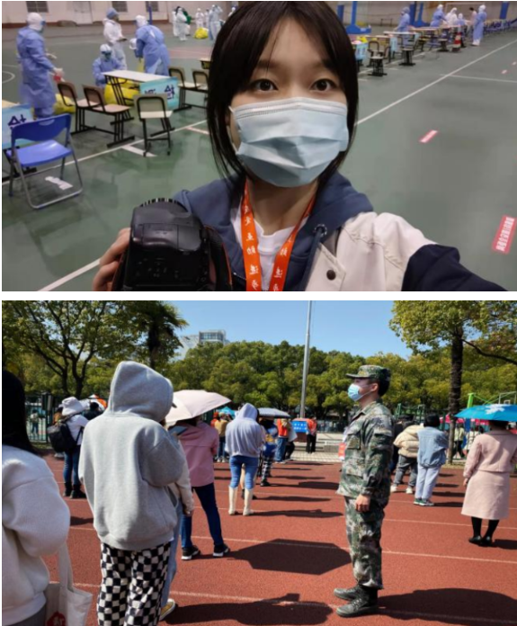 从奉贤校区48小时紧急闭环管理到两校区的准封闭管理,已经过去将近一个月。刘雨欣作为学生宣传条线负责人,每天汇总各类宣传内容,和志愿者一起捕捉校园的感人瞬间。在汇总照片的时候她总有一些小小的惊喜和期待,或许这一次的摄影师能恰好拍到“他”呢,她总是都格外关注那些军绿色的身影。