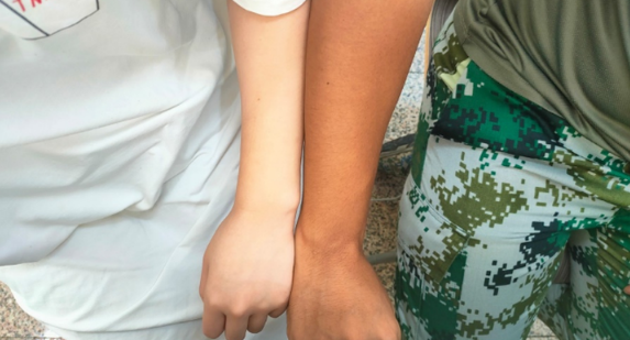 在东部校区开展核酸检测的过程中,我负责管理前来做核酸检测同学的队伍。那天太阳很晒,我在人群中穿梭,提醒同学们打开健康云二维码,保持队伍间距,一站就是几个小时。胜鹏看见我在队伍里不停穿梭,走上前给我递了一瓶水,对我说“辛苦了”。但我不觉得辛苦,在最需要我的时候,在最需要共产党员的时候,我都会毫不犹豫地站出来。我回给他一个比心的手势,这就是我们之间的默契。