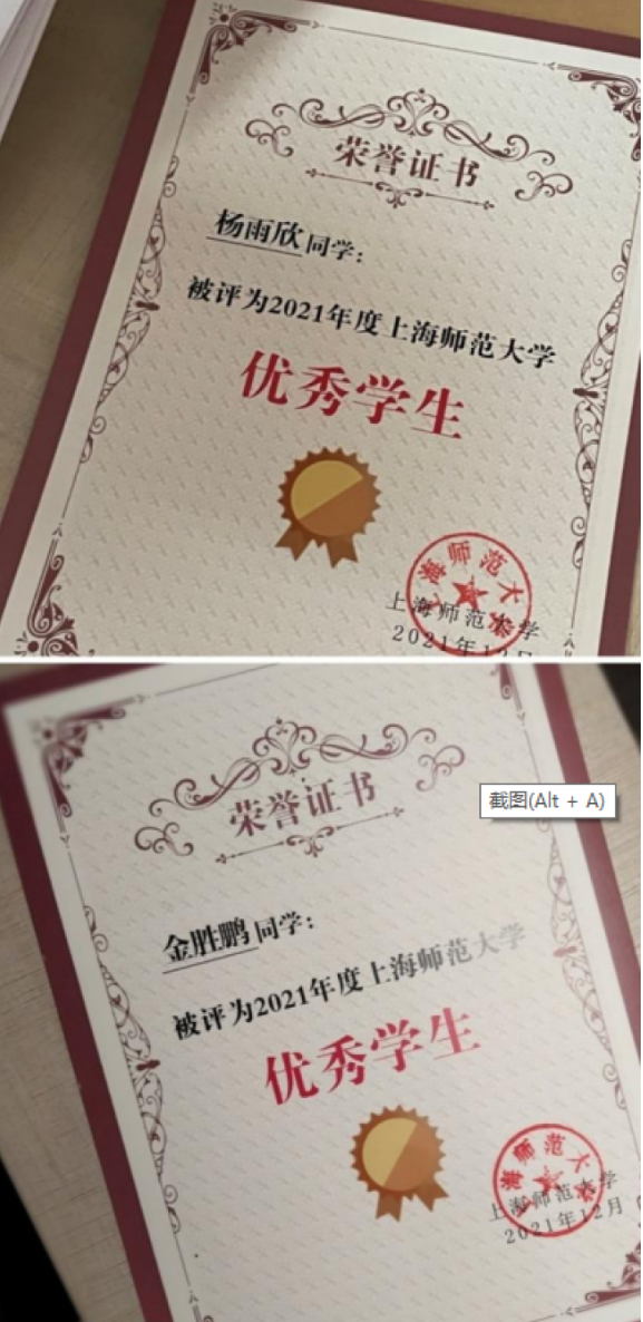 两人同时获得2021年度“校优秀学生”称号