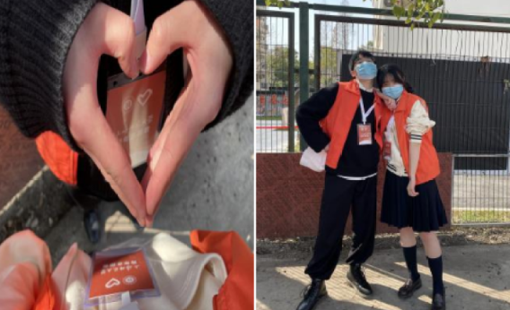 参与志愿服务当天,来自教育学院的杨雨欣和美术学院的金胜鹏共同在上海师大东部校区进行志愿服务工作。他们一个负责带队,一个负责引导;穿上橙色小马甲,尽管背靠背看不见彼此,但心却一直在一起。在志愿的过程中,两人互相关心,互相鼓励,共同留下了一段特殊的回忆。