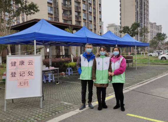 杨岑岑的父亲和母亲负责引导居民有序排队、戴好口罩、保持安全距离,并提醒居民准备好二维码,杨岑岑则帮助不会使用健康云的居民完成健康云核酸检测的信息填写,核酸检测也在一家三口明确的分工下有序开展。