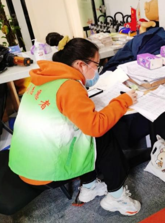 赵孜卿的外婆作为家中楼道的楼组长,负责按照小区居委与物业的时间与检测顺序安排,在轮到自己楼道做核酸时,挨家挨户上门让楼道居民及时下楼做核酸检测,登记小区内医护人员以及需要帮助的居民人数及相关信息。而母亲则在核酸检测一线当“大白”,负责PDA核酸检测的二维码扫描,带领检测的医护人员上门为不方便下楼的居民做核酸检测。赵孜卿则作为小区志愿者中年纪最小的一位,听从居委书记的安排,带领楼道内的居民在楼下集合统计完人数后至核酸检测处,在检测现场维持队伍秩序,分发小区封闭管理送给居民的慰问品。
