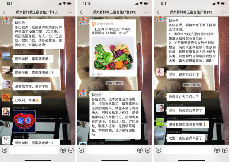 他们组织建立教宿楼微信群,实时发布核酸检测通知,分享购买物资的平台及渠道,及时向住户们传达疫情新政策,分享小区新动态,打破了楼栋信息闭塞的局面。