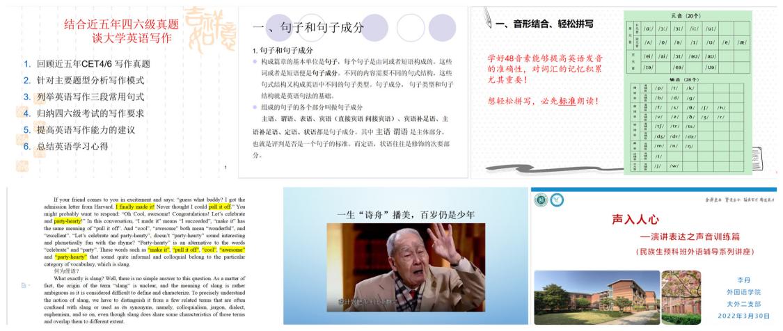 大外一支部王慧敏老师结合近五年四六级真题为同学们解析了大学英语写作的要点并提出Plan、Perseverance、Progress语言学习的方法;谢晓晨老师带来《英语句子与句子成分》讲座为同学们进行了细致的语法分析;徐楠老师为同学们带来了音形结合、注重语境、举一反三、日积月累的词汇学习有效策略。大外二支部陈赢老师带来了《语言与社会:浅谈俚语》讲座为同学们分析俚语在不同社会环境中的区别;李昆老师以翻译家许渊冲、章振邦的人物故事入手,为同学们讲述学者精神对外语学习的启示;李丹(小)老师带来则通过互动和声音表现展示方式,开展了《声入人心—演讲表达之声音训练》讲座。