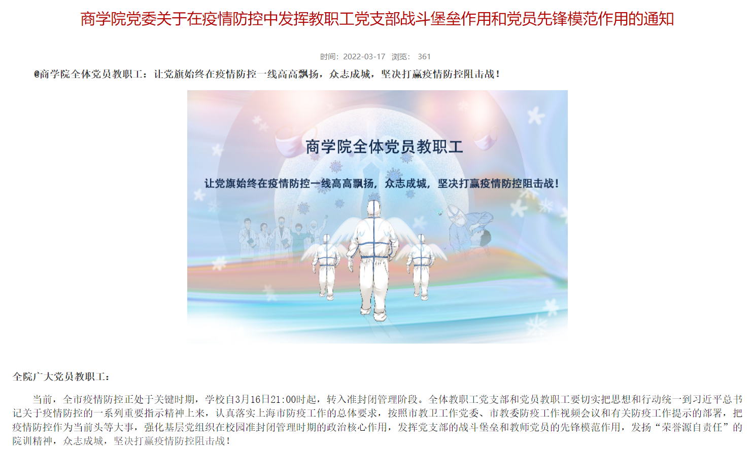 上海本轮新冠肺炎疫情传播链复杂,疫情防控形势极为严峻。3月17日,商学院党委向全体教职工党支部和教师党员发布了《关于在疫情防控中发挥教职工党支部战斗堡垒作用和党员先锋模范作用的通知》,号召全体教职工党支部和教师党员要进一步把思想和行动统一到习近平总书记关于疫情防控的一系列重要指示精神上来,认真落实上海市防疫工作的总体要求,按照市教卫工作党委防疫工作视频会议和有关防疫工作提示的部署,把疫情防控作为当前头等大事,强化基层党组织的政治核心作用,发挥党支部的战斗堡垒和教师党员的先锋模范作用,发扬“荣誉源自责任”的院训精神,众志成城,坚决打赢疫情防控阻击战!
